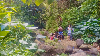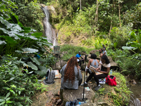 Day 2 was a more rigorous but perhaps even more satisfying affair. Undaunted by the hike down a steep winding track, twenty-two intrepid artists made it to the Adoudou Falls at Mc. Diamed. Perched on rounded river rocks and boulders scattered within the stream, they transferred the sunlit greens and shadows, the moisture and humid wetness, the gurgling water, the basin-like pool, the glistening falls, and the tranquility of the scene to their canvasses.