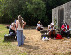 Day 1 of Paint the Village was held at the Morne Le Blanc Nature Heritage Site. Spread around the ruins of the old American missile tracking station, forty-three professional artists, art students, children, and visual art enthusiasts painted a variety of subjects including the ruins, flowers, architectural elements like a traditional standpipe, and nature. A still life, comprising a coalpot and clay pot, gwaj, tanbou, and charcoal iron, was also set up. This catered for young children and fledgling artists reluctant to paint more involved subjects.